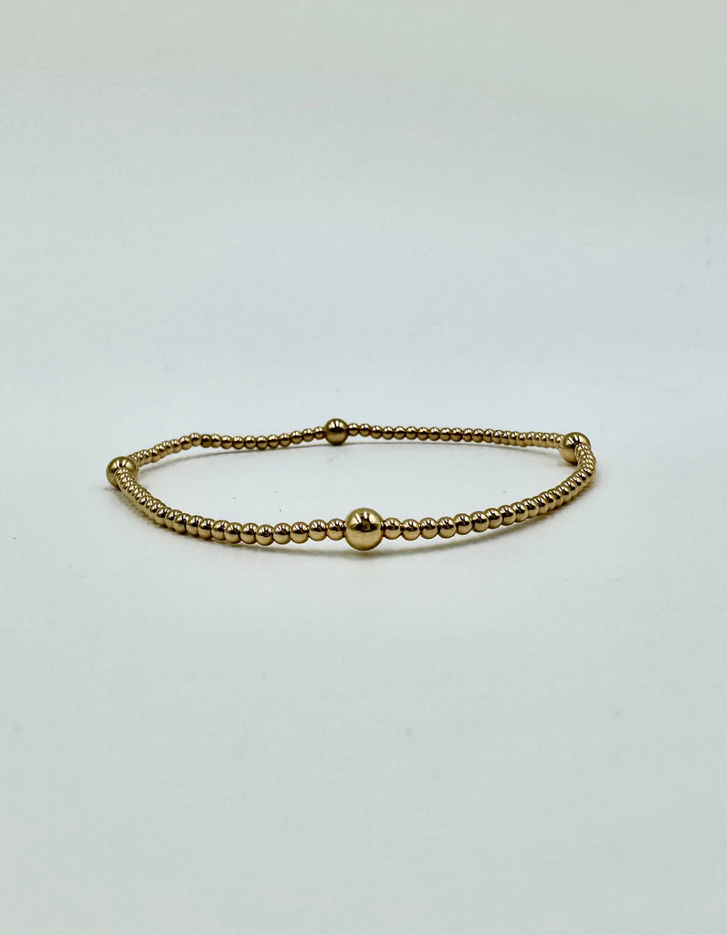 These petite gold bead bracelets are fine and delicate and feature our smaller 2 mm beads with four larger beads inset. Beautifully feminine worn alone or stacked with other DANE Jewellery bracelets and wraps.